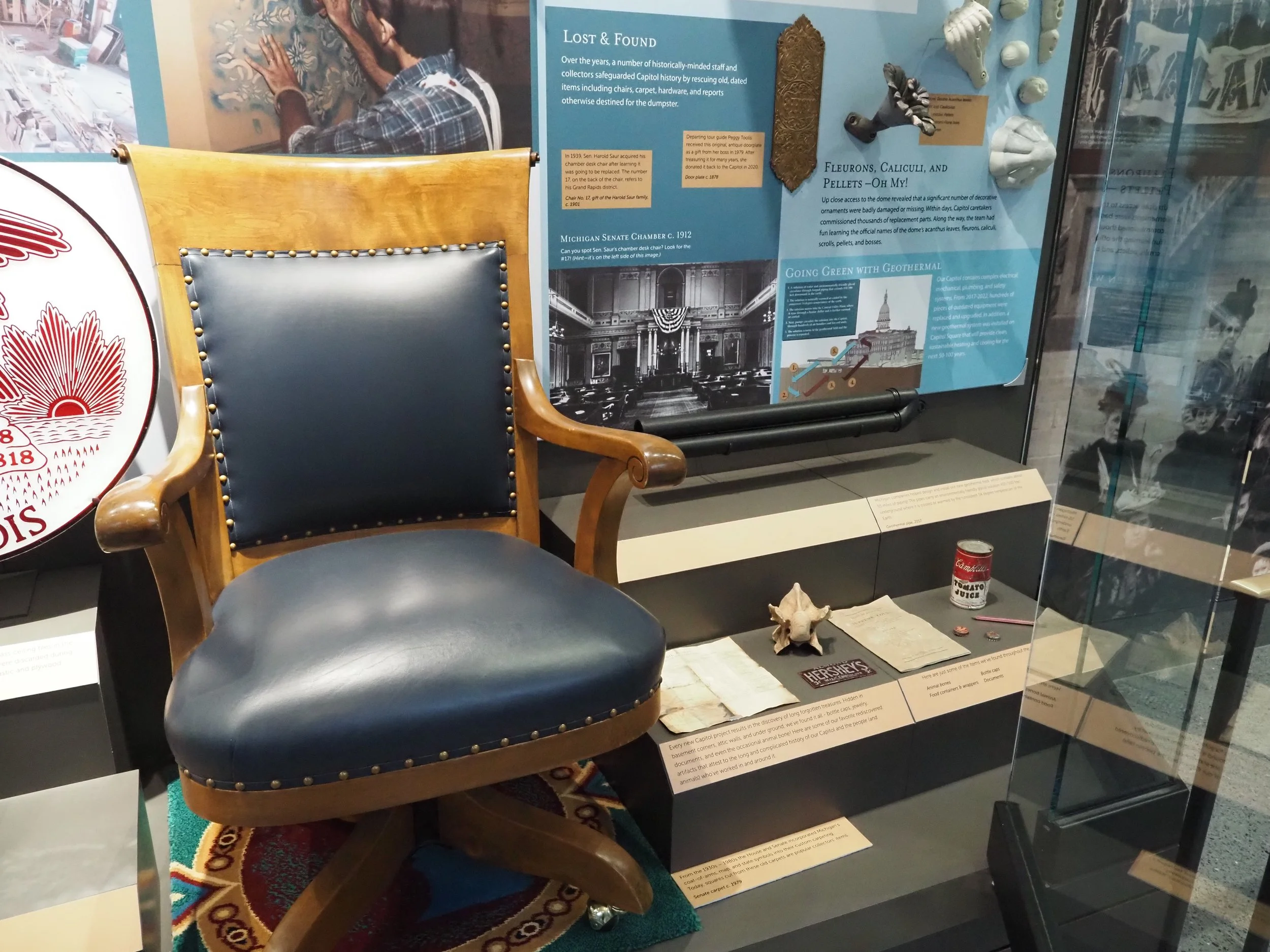 This case is what can be considered a “period room” exhibit. The office is dressed with both original and reproduction furniture and office emphemra to resemble, to the best of our ability, how Capitol offices would have appeared in the first few decades of the building. Each year, this office is redressed to recognize a specific state department or agency who had a space in the Capitol during this time. So far, the office has paid homage to the Adjutant General, the Superintendent of Public Instruction, the Board of Health, and the Michigan Pioneer and Historical Society.