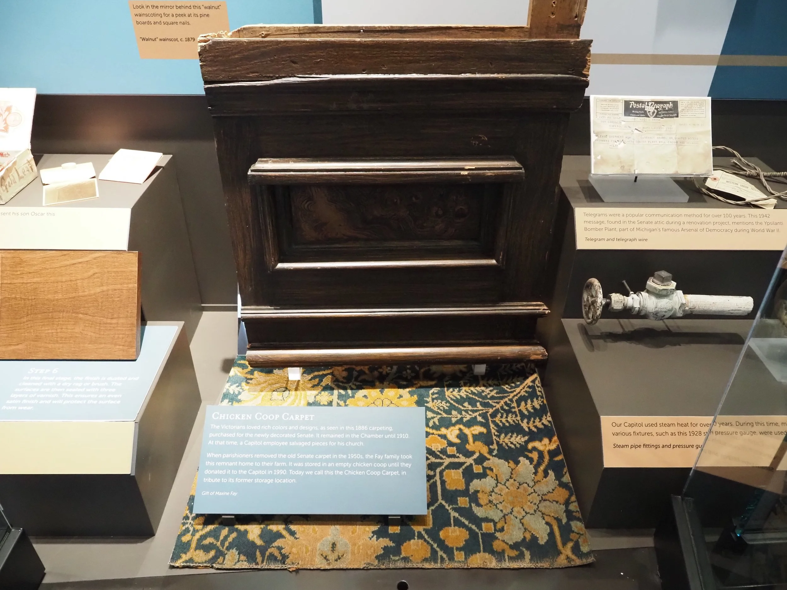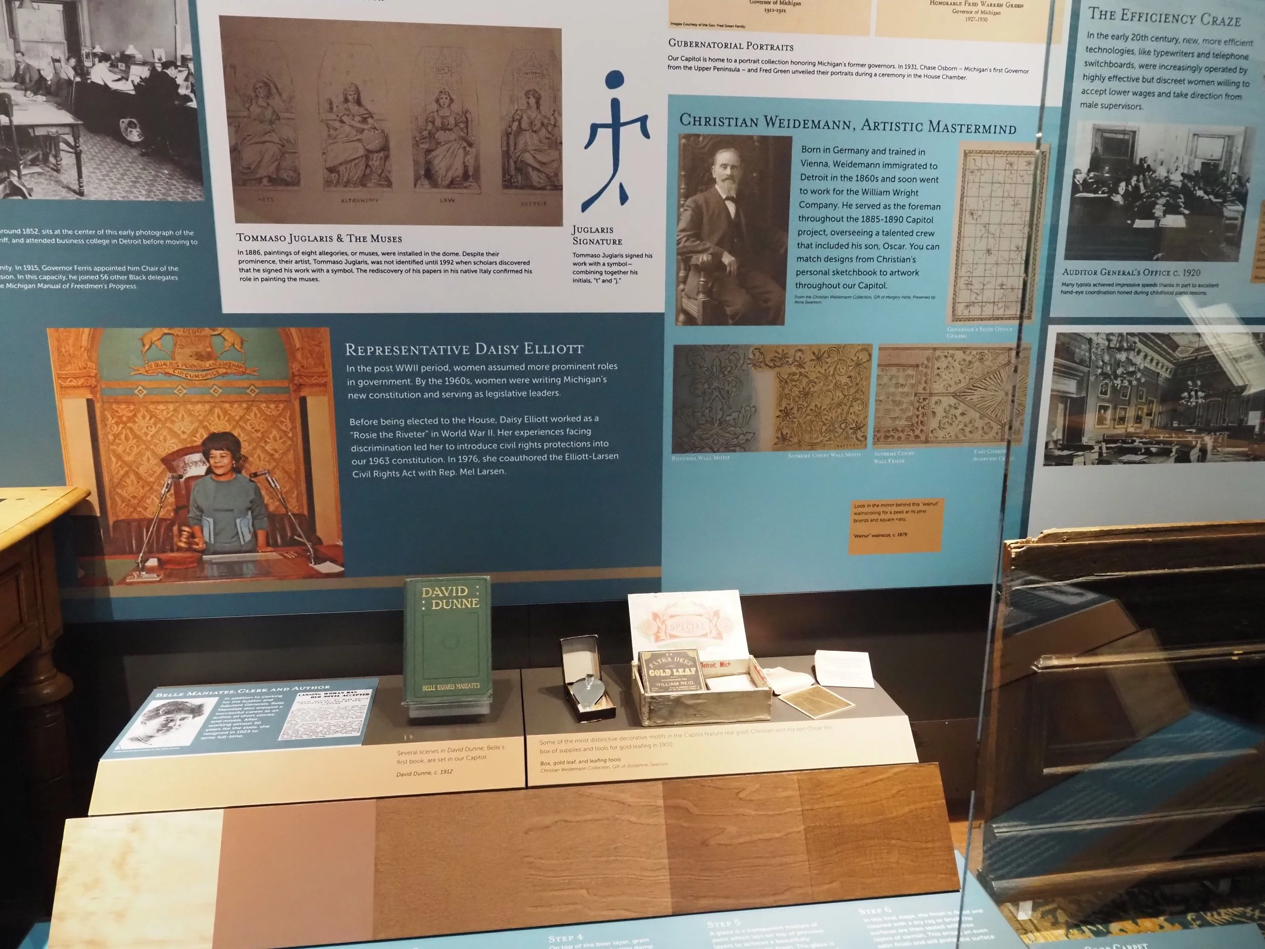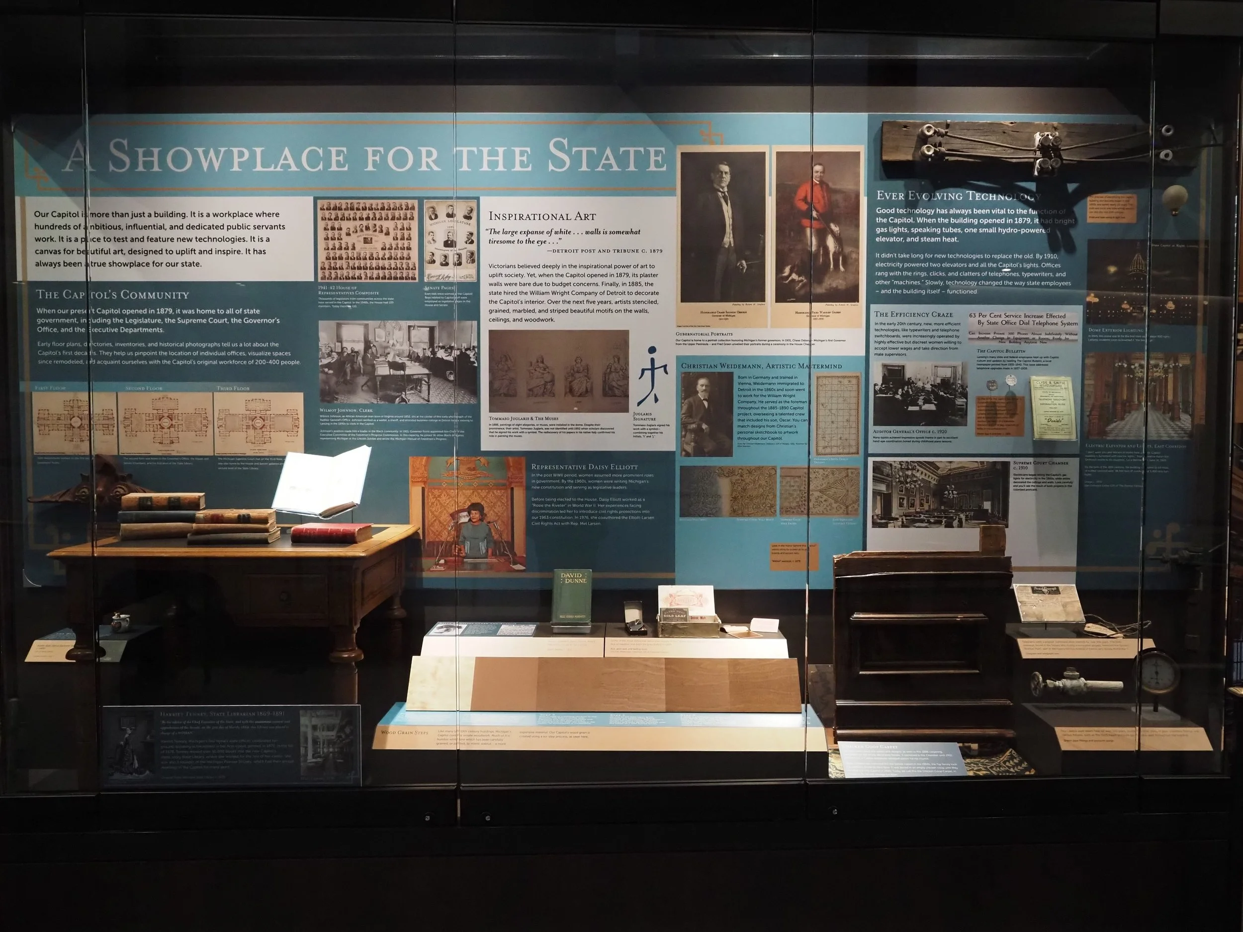 This case explores the various ways in which the Capitol has served as a showplace, or leader, for Michigan. During its history, the Capitol has been influential in its hiring of people from diverse backgrounds. The interior surfaces of the Capitol are showplaces for the finest and most inspiring Victorian artwork Michigan has to offer. The Capitol has led the state in technological advancement, from the lighting of the dome in 1905 to show off the power of the new electric light bulb, to the installation of the nation's largest state capitol geothermal system in 2019.