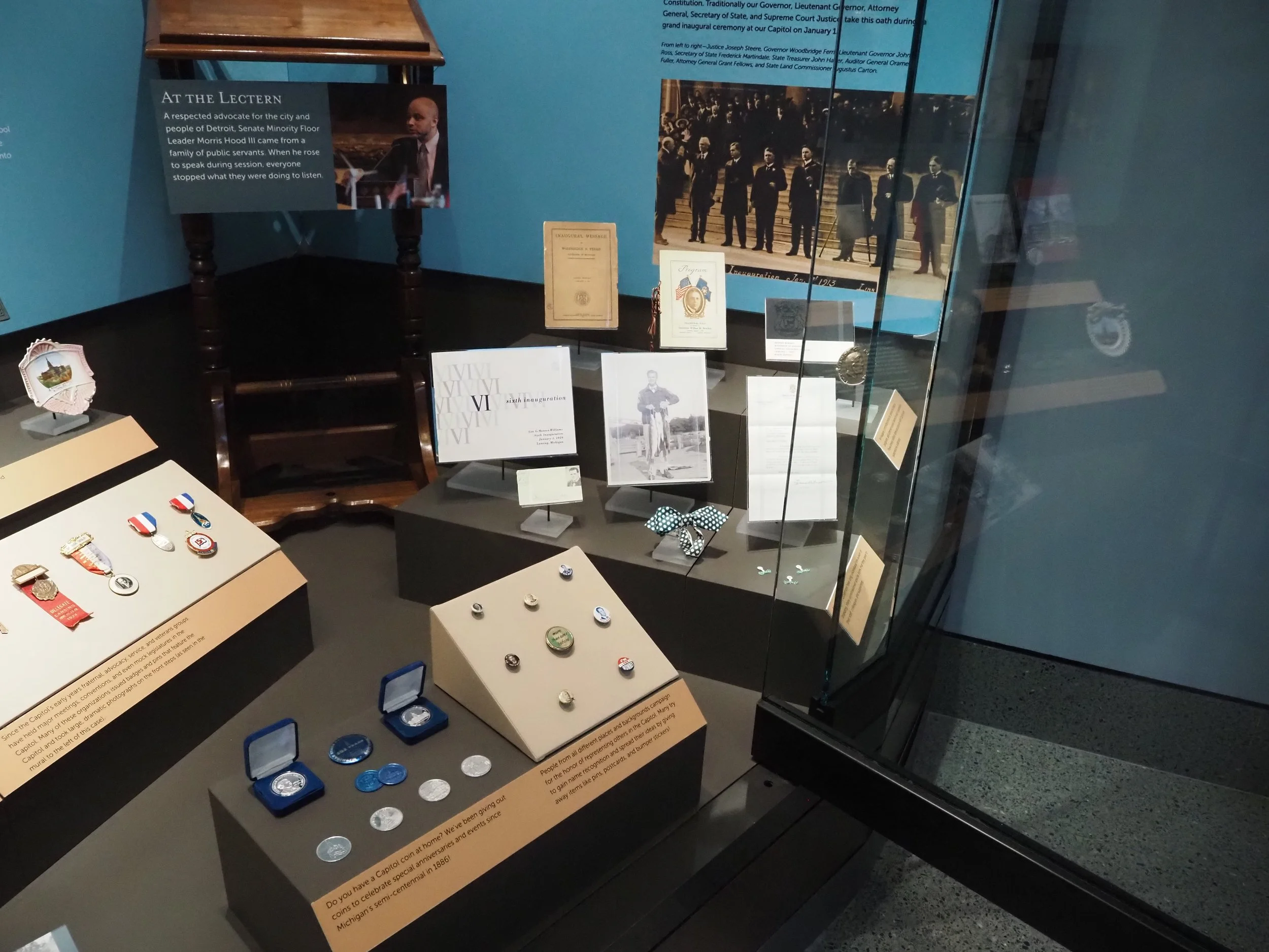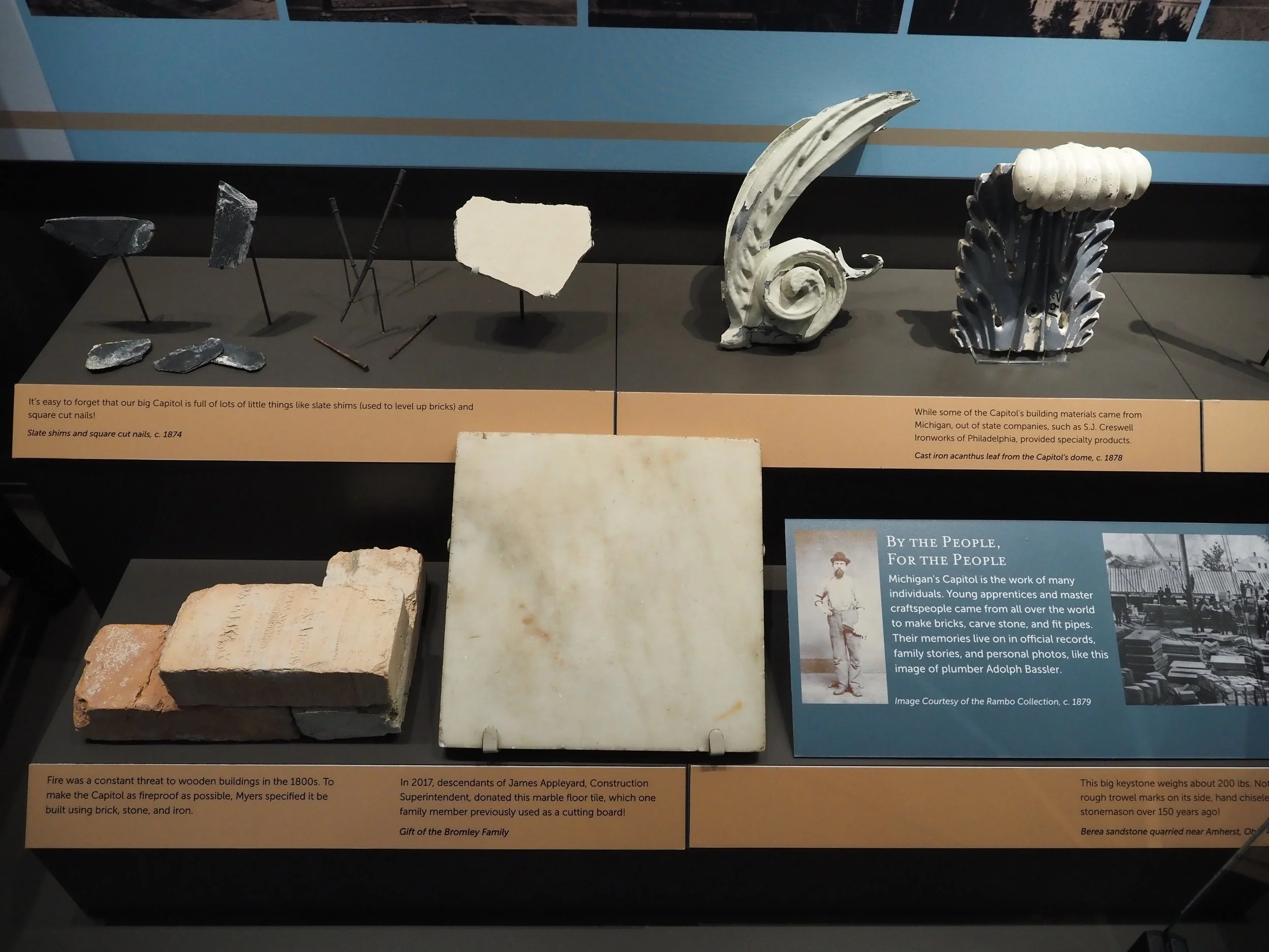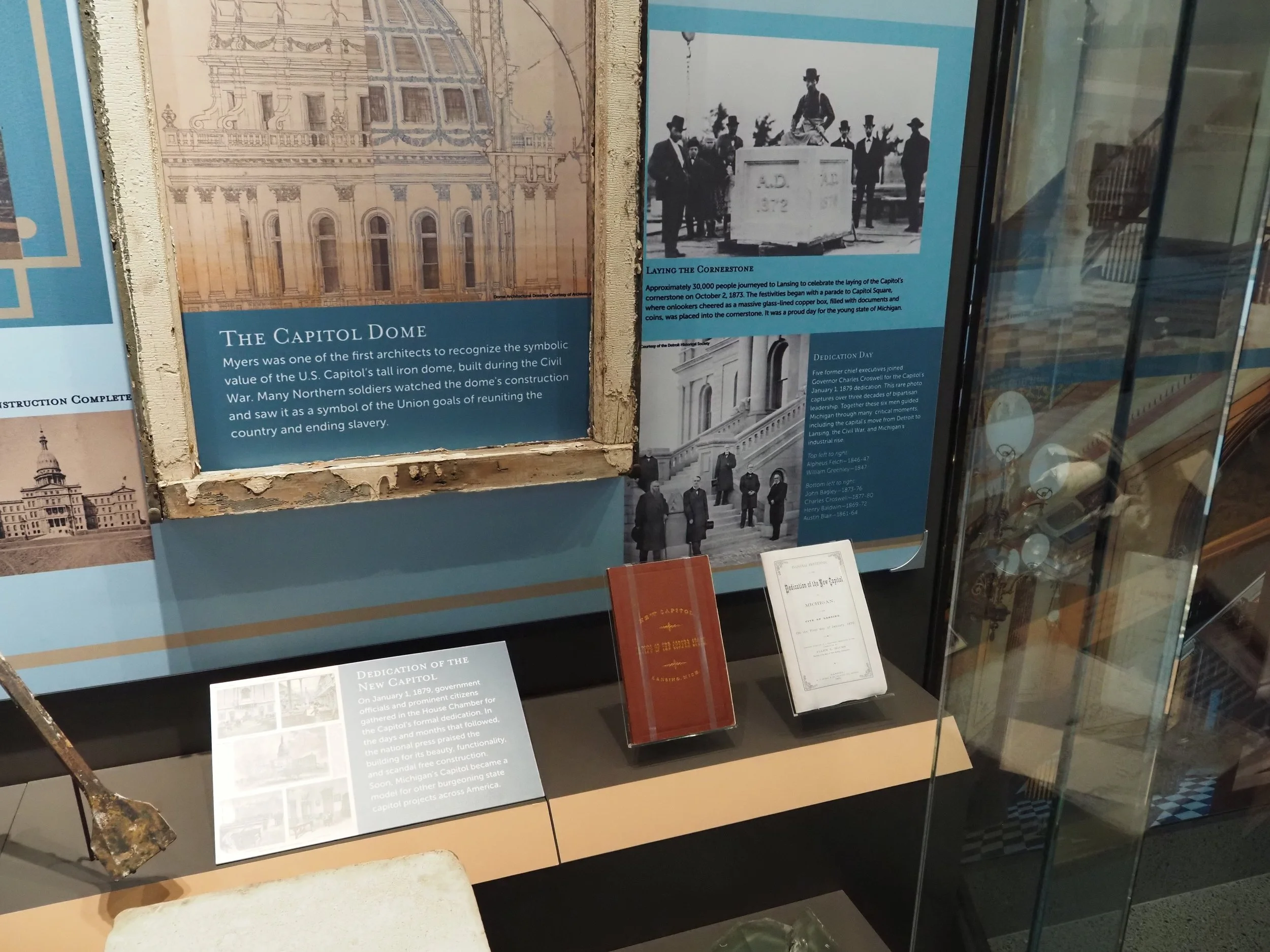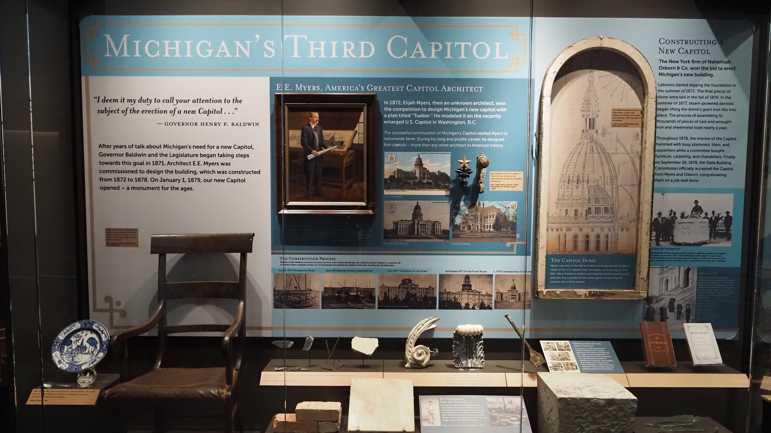 This exhibit case details the legacy of our first two Capitols, the selection of Elijah E. Myers' building design titled "Tuebor," the 6 year construction process, the cornerstone laying and opening dedication ceremonies, and the materials used to construct the building.