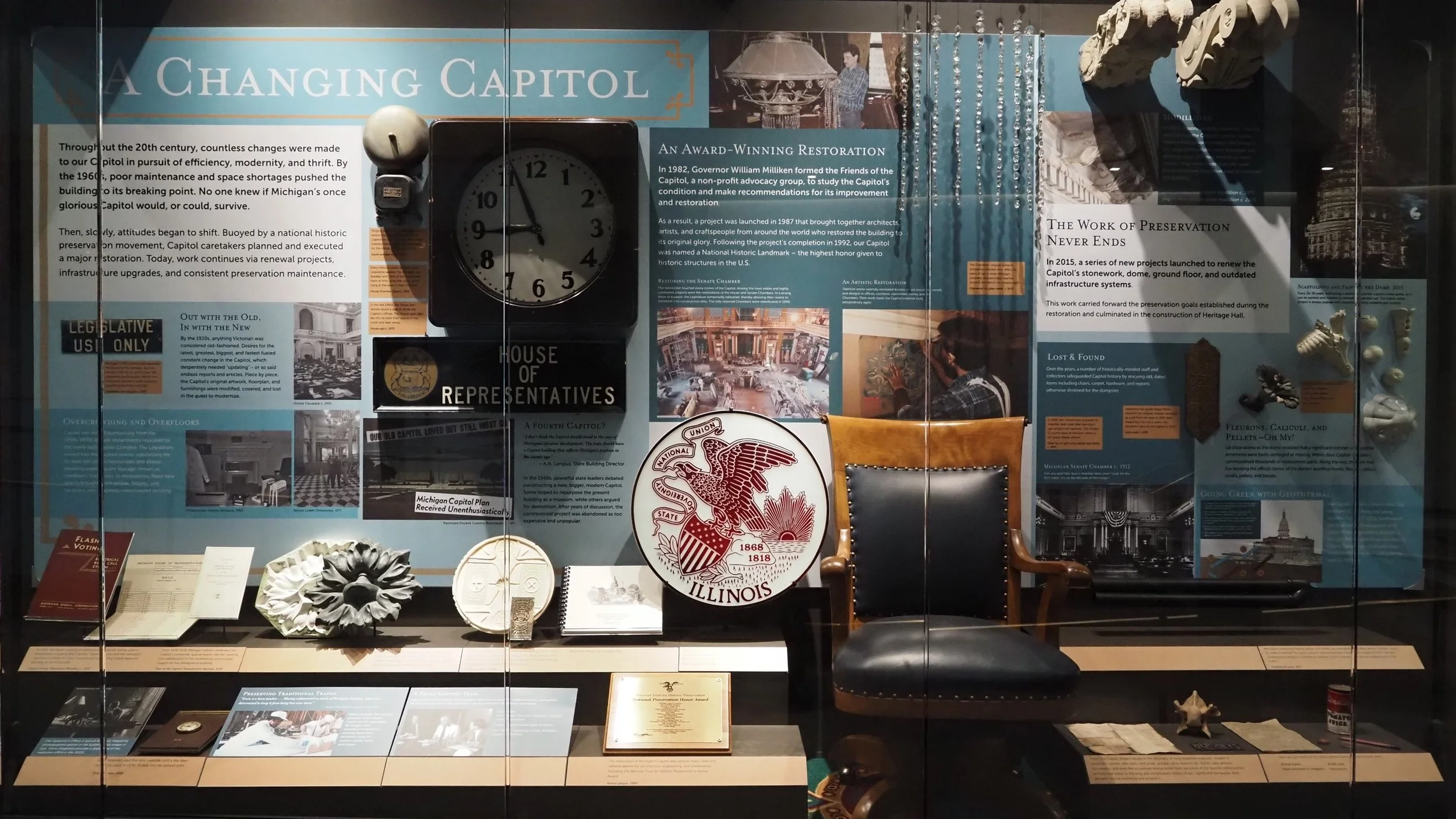 "Throughout the 20th century, countless changes were made to our Capitol in pursuit of efficiency, modernity, and thrift. By the 1960s, poor maintenance and space shortages pushed the building to its breaking point. No one knew if Michigan's once glorious Capitol would, or could, survive. Then slowly, attitudes began to shift. Buoyed by a national preservation movement, Capitol caretakers planned and executed a major restoration. Today, work continues via renewal projects, infrastructure upgrades, and consistent preservation maintenance."