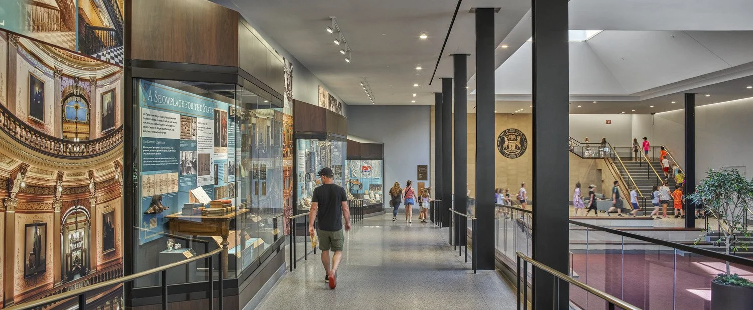 For over a century, Michigan leaders dreamed of expanding the Capitol - but early plans were too costly or disruptive. In 2019, that vision finally took shape with the creation of Heritage Hall: a 40,000-square-foot underground visitor and event center on the west side of the Capitol. Designed to serve the public without altering the Capitol’s historic footprint, Heritage Hall includes a soaring atrium, a 300-person multipurpose room, and new educational and exhibit spaces. This page allows visitors explore Heritage Hall’s exhibits from wherever you happen to be!